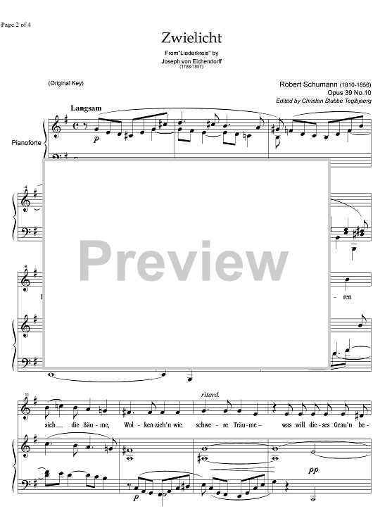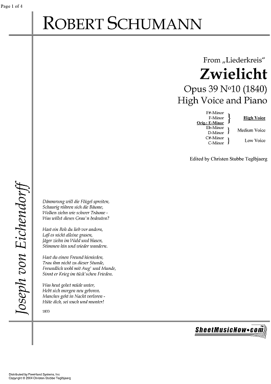 Digital Sheet Music for Zwielicht Op.39 No.10 by , Robert Schumann scored for Soprano or Tenor/Piano; id:343368